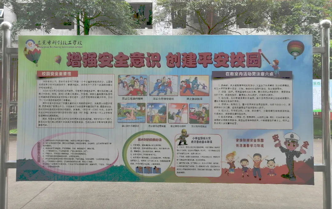 为认真贯彻落实《东莞市2020年“安全生产月”和“安全生产莞邑(万里)行”活动方案》(东安办【2020】77号)的文件精神,全力做好校园安全工作,确保学校师生生命和财产安全。校园内多处显眼位置悬挂了“安全生产月”横幅:“安全是生命之本,提高安全意识,广泛深入开展安全生产月活动”、“普及安全生产知识,提高全民安全意识,创建平安校园”、“ 珍爱生命,预防溺水”……