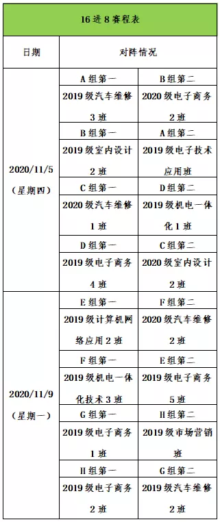 据悉,本次比赛共有32支班级队伍参赛,分八个比赛组,每个小组内各有四支球队。小组赛采用循环赛制,小组循环赛阶段共有48场比赛。小组循环赛结束后,每个小组内积分排在前两名的球队晋级16强。