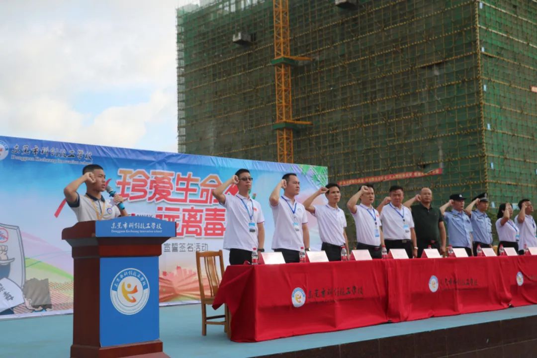 紧接着,由2020级计算机1班刘俊聪同学领誓,全校师生在国旗下庄严宣誓:”遵纪守法,真爱生命,远离毒品,坚决与毒品作斗争!从我做起,以抵制毒品为荣,以吸毒为耻!牢记历史使命,洁身自爱,决不染毒“。宣誓后,全体师生纷纷在主题墙上签名承诺终身不吸毒、不贩毒、不制毒、不种毒,积极投身到禁毒斗争行列,为国家禁毒事业做出自己应有的贡献。