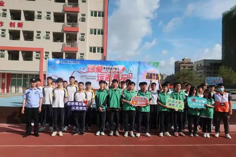 为了强化禁毒宣传教育意识,努力营造浓厚的校园禁毒舆论氛围,让广大师生深刻认识禁毒工作的重大意义,以及毒品对国家、社会、家庭和个人的严重危害,从而在今后的学习,生活和工作中,真正做到“珍爱生命 远离毒品”。5月17日上午,我校在操场隆重举行了一场主题为“珍爱生命 远离毒品”的禁毒宣誓签名仪式。活动特别邀请了大岭山镇禁毒办陈锦华专职副主任、大岭山镇禁毒办劳同重专职民警、大岭山公安分局杨屋派出所大岭警务室徐胜胜警官莅临我校出席活动。我校朱作友校长、彭文涛常务副校长、李小环德育副校长以及各部门职能负责人也参加了本次活动。