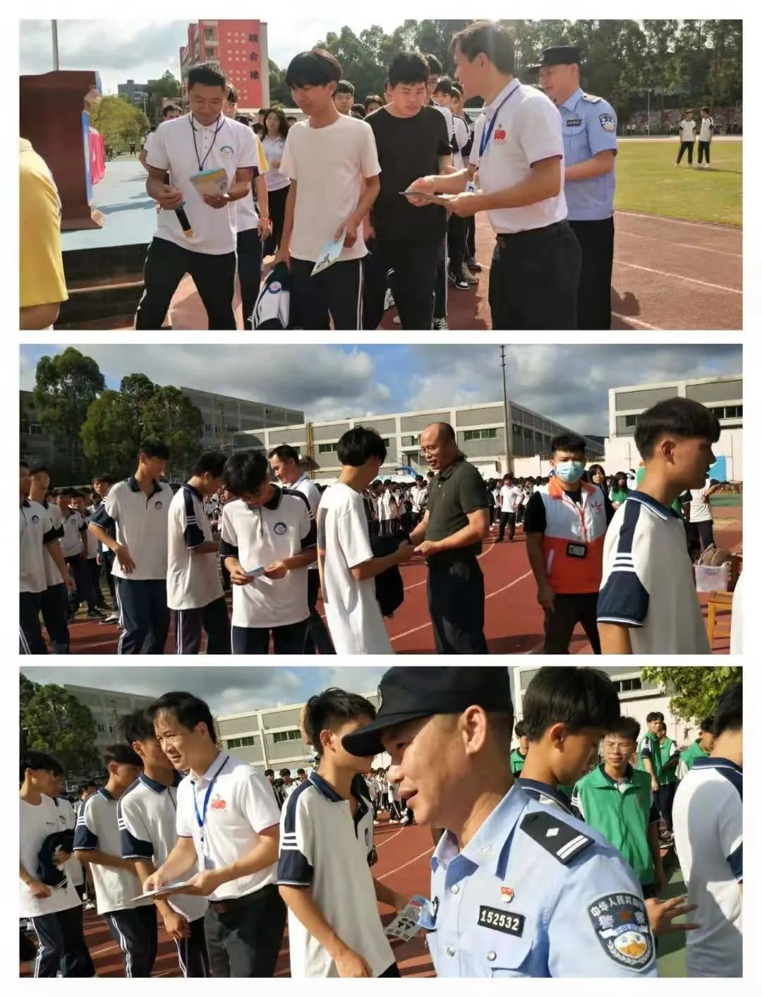 彭文涛常务副校长、大岭山镇禁毒办陈锦华专职副主任、劳同重专职民警现场派发禁毒宣传资料。