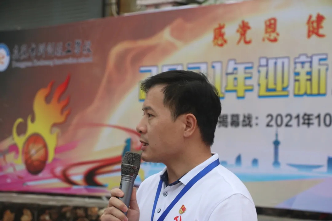 彭校长在开幕式致辞。为迎接新生入学,丰富同学们课余生活,进一步推动校园体育活动开展,增强各班级凝聚力,特举办本次“感党恩,健体魄”2021年迎新篮球联赛。相信这次比赛能够很好地展现同学们高超的竞技水平和良好的精神风貌,能够促进同学们之间的交流。也希望运动员们在比赛过程中赛出友谊,赛出风格,赛出成绩。最后,彭校长预祝迎新篮球赛能够取得圆满成功。