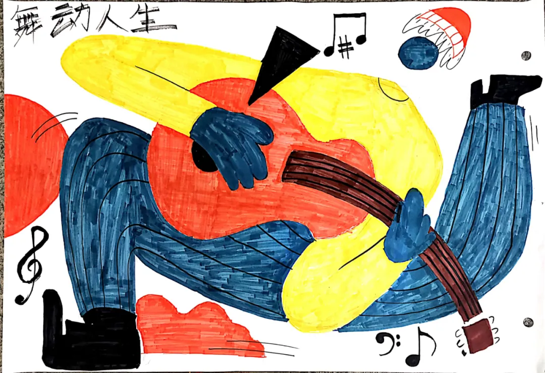 ▲小组宣传画,寓意:以音乐和舞蹈为创作主题,夸张的人物形态,寓意着人生即是一个色彩斑斓的大舞台,每一个人都是自己人生舞台的主角,何不让自己的人生增添几分光彩,让我们尽情的舞动起来吧!