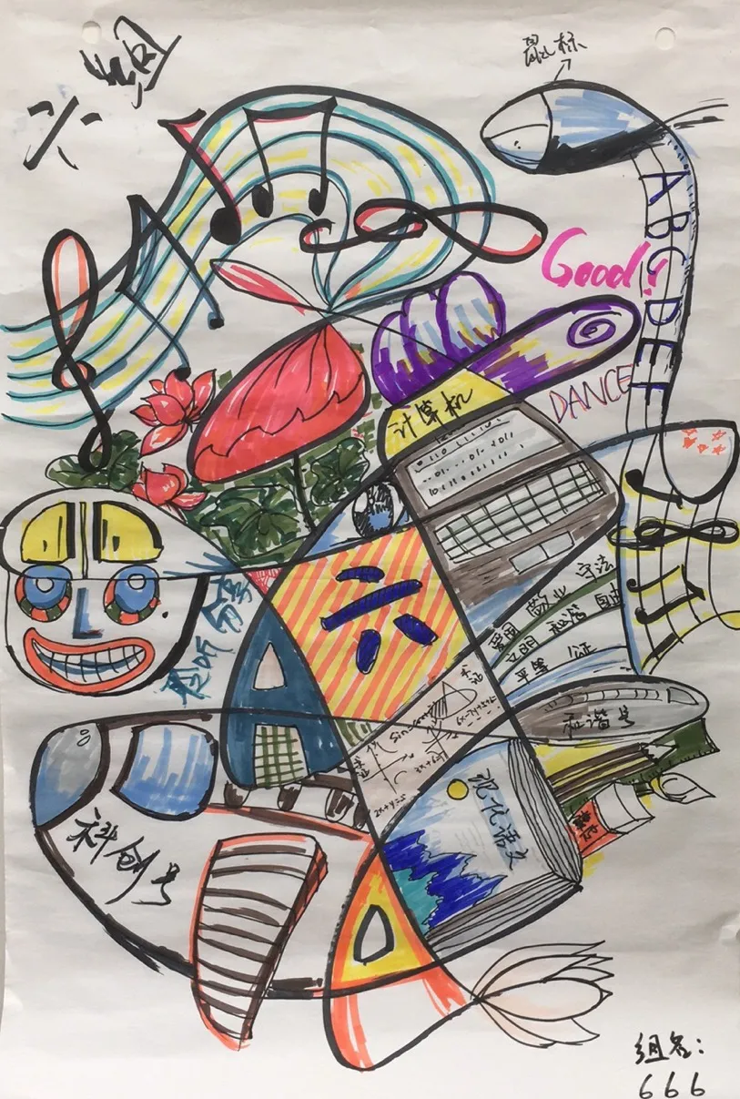 ▲小组宣传画,寓意:用完整的线条将画面分割,通过即时创意绘画将“科创号”这大家庭所向往的美好生活绘入其中,寓意全体师生在所选的正确道路上”六六大顺“。
