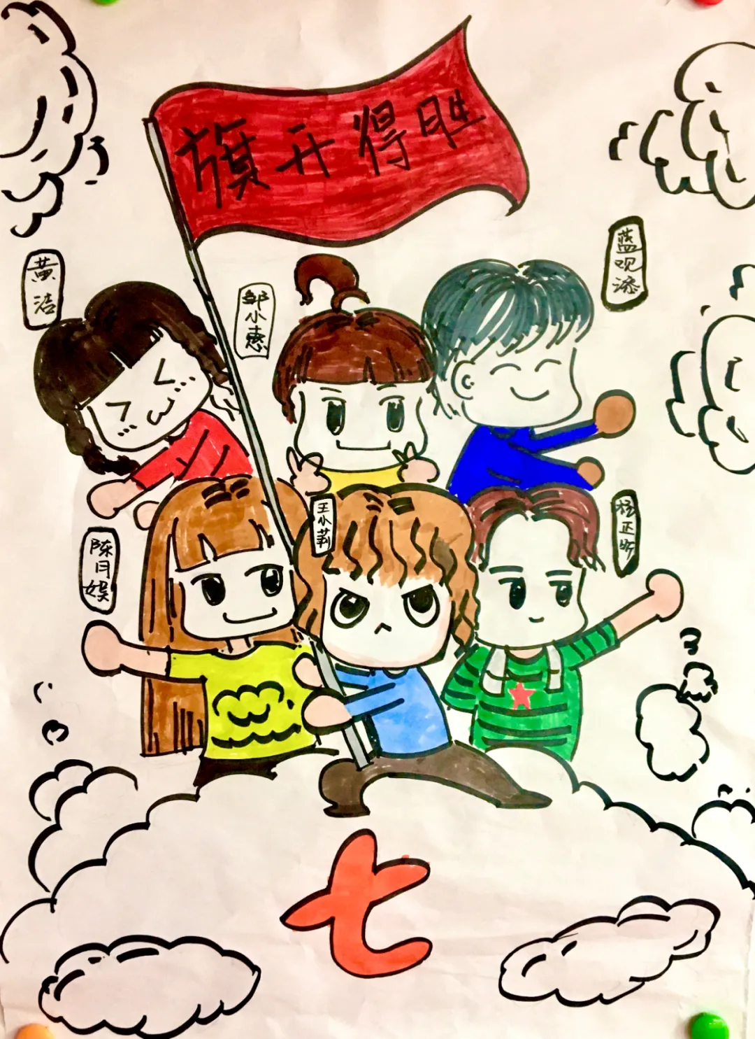 ▲小组宣传画,寓意:“七”谐音“旗”,因此取名”旗开得胜“,海报中组员高举旗帜,代表着团队齐心协力,向着共同的目标前进!