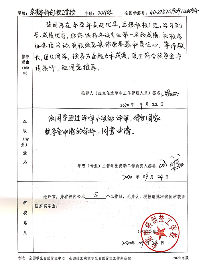 根据教财函[2019]104号《教育部 人力资源社会保障部 财政部关于印发《中等职业教育国家奖学金评审暂行办法》的通知文件要求,结合我校实际情况,本着公平、公正、公开的原则,我校2019-2020年国家奖学金评定工作已结束。2019级电子技术应用专业: 颜道英 同学评定为国家奖学金获得者。