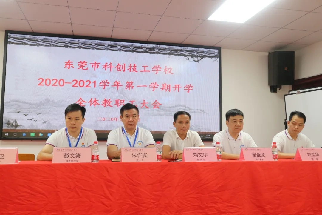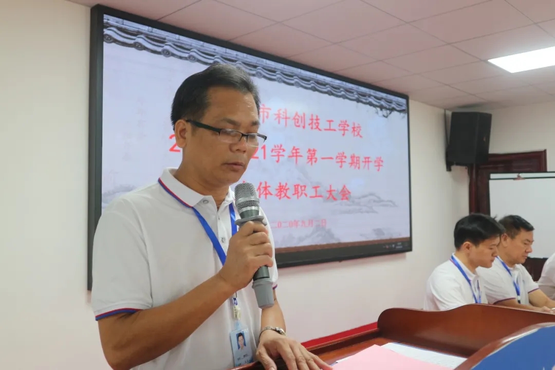 2020年9月2日上午,以“凝心聚力谋发展,再创辉煌谱新篇”为主题的2020-2021学年第一学期东莞市科创技工学校全校教职工大会在我校科创报告厅召开,会议由办公室主任廖彩卫老师主持。