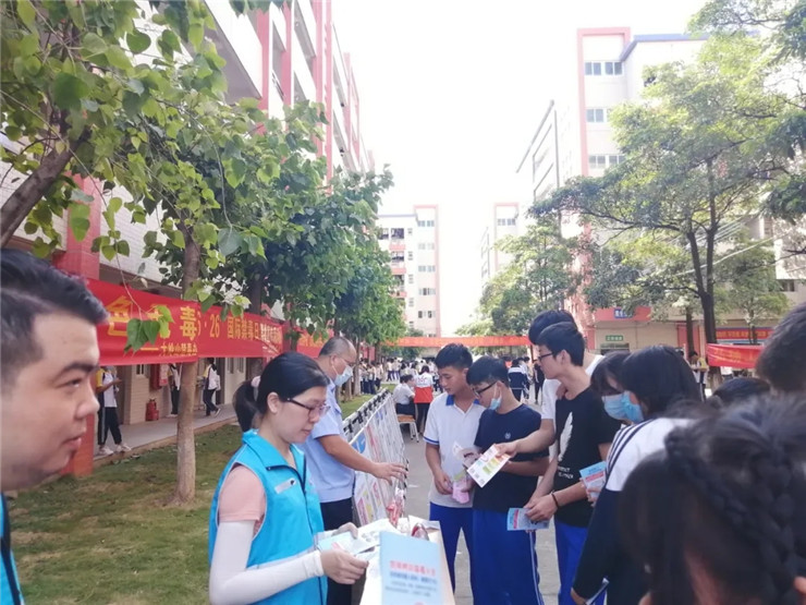 为加强广大青少年学生对毒品危害的认识和提高禁毒意识;特别是引导青少年学生了解禁毒知识、认清毒品危害、自觉远离毒品、增强青少年防毒、拒毒的禁毒意识和能力,预防和减少青少年涉毒违法犯罪,营造有利于青少年健康成长的社会环境。6月23日下午四点,大岭山镇禁毒办联合镇公安分局、镇司法分局、镇关工委等有关部门走入我校,开展禁毒宣传系列活动。我校教职员工、广大学生积极参与,深入了解禁毒知识、认清毒品危害、通过本次活动增强防毒、拒毒的禁毒意识和能力,坚决向毒品说“不”!