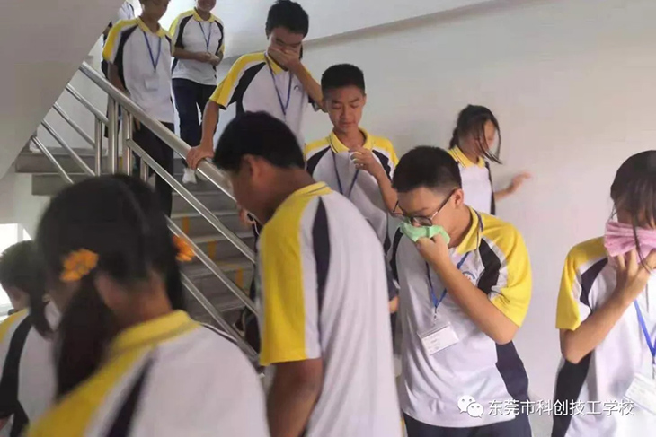 “事发现场”的同学们用湿毛巾等防烟物品捂着口鼻,在老师的指引下从各个出口迅速有序“逃离”到指定的安全位置。