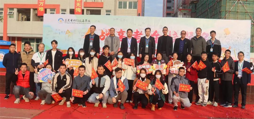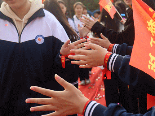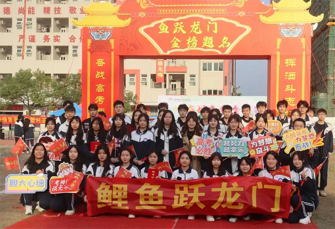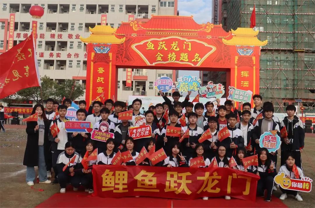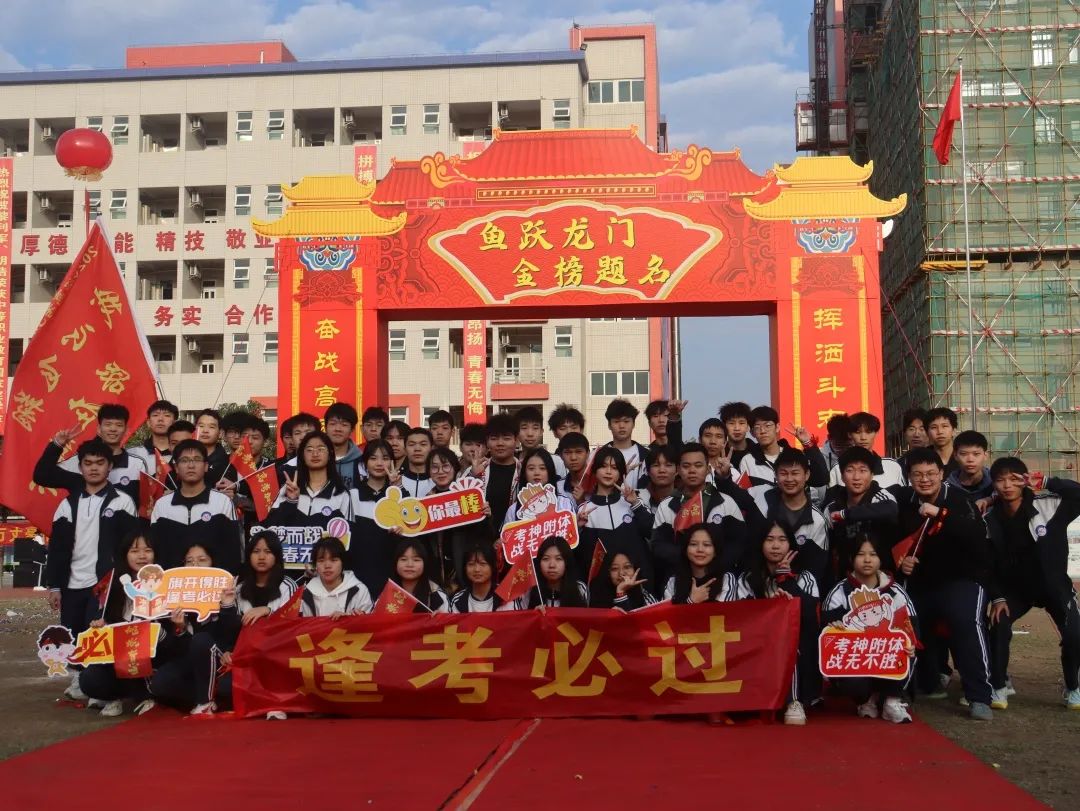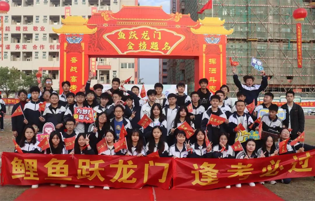 “今日莫欺少年穷,他朝鲤鱼跃龙门”,那奔跑的身姿,是学子心中的雄雄壮志,是阳光少年的无悔誓言。2023届全体考生有序穿越龙门,寓意“一举高中”!现场全体同学手绑红腕带、手持小旗为高考学子加油助威,共同祝愿考生们旗开得胜,金榜题名!